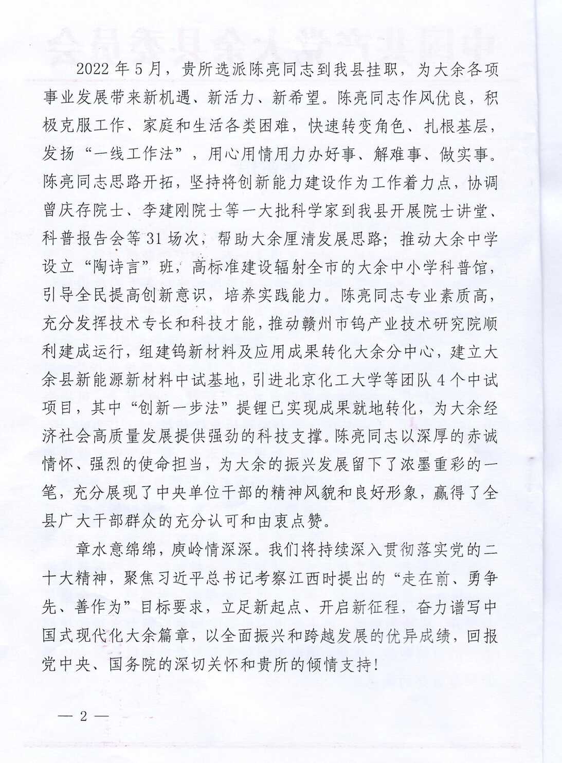注:2022年6月,陈亮被中组部选派到江西省大余县挂职,职务:大余县委常委、副县长;2024年6月结束挂职返回大气所任科技处副处长。