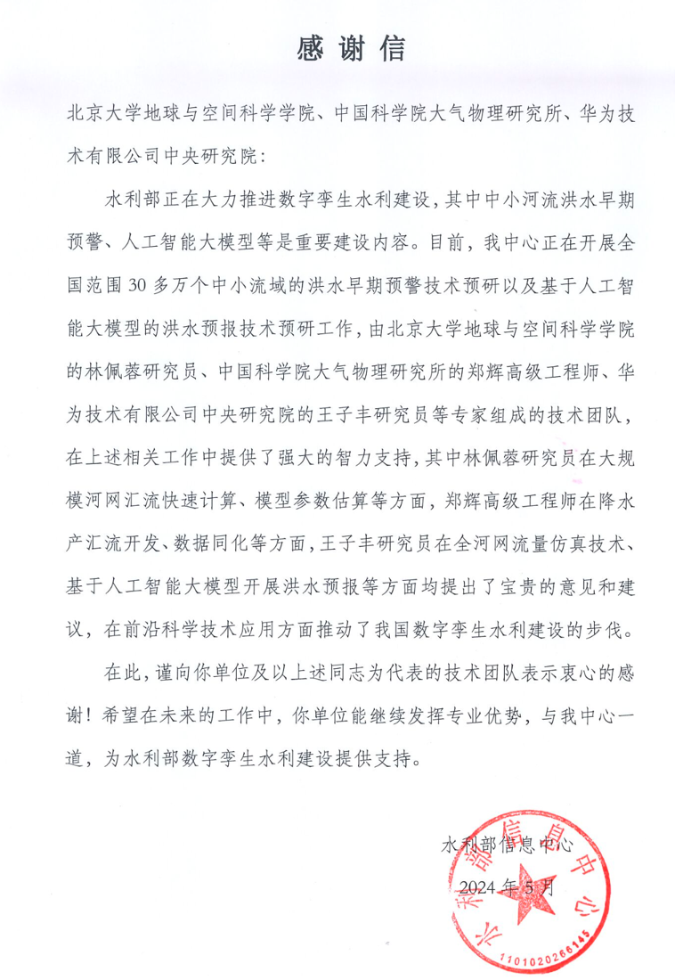 近日,水利部信息中心发来感谢信,感谢大气所东亚中心郑辉高级工程师对水利部业务工作的支持。