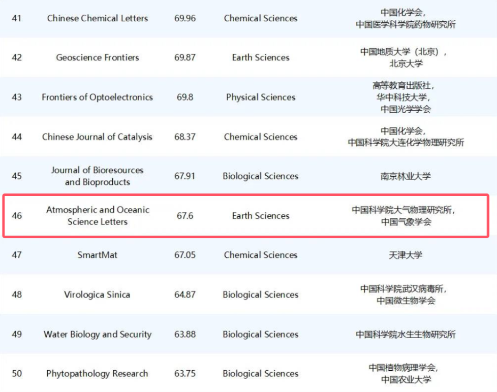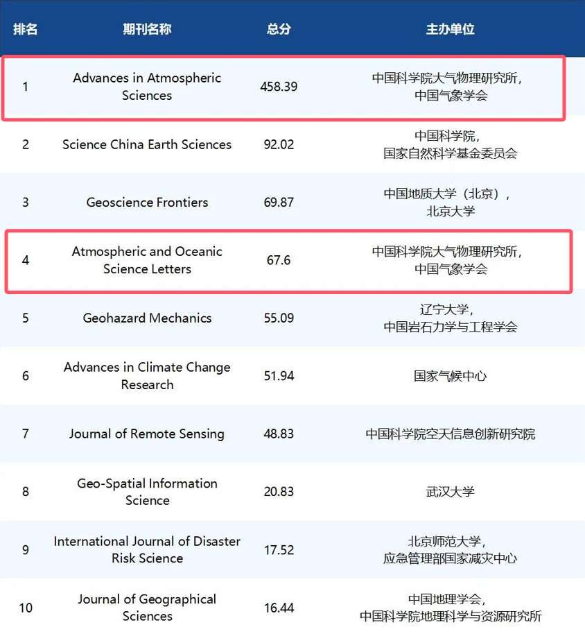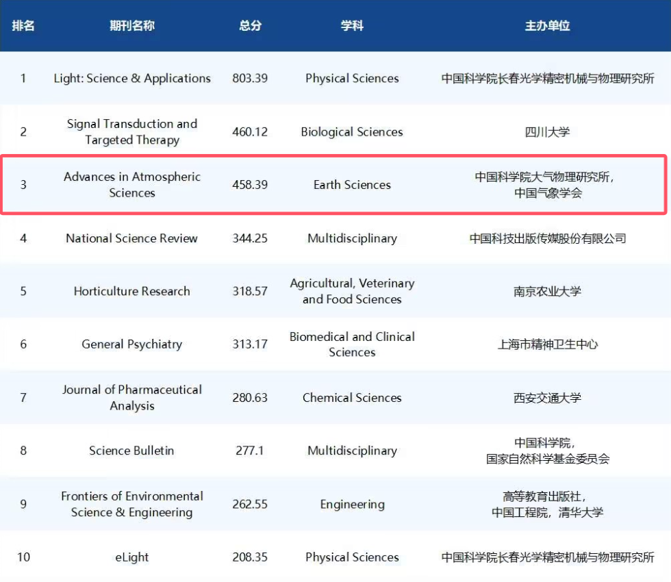 2024年11月2日,《2024中国英文科技期刊海外媒体传播影响力报告》正式发布,大气物理研究所主办的两本英文期刊《大气科学进展》(AAS)和《大气和海洋科学快报》(AOSL)表现出色,在“中国英文科技期刊海外媒体传播百强榜单”分别位列第三和第46,并在“地球科学学科期刊海外媒体传播Top 10”榜单上名列十强前茅,AAS位列第一,AOSL位列第四。