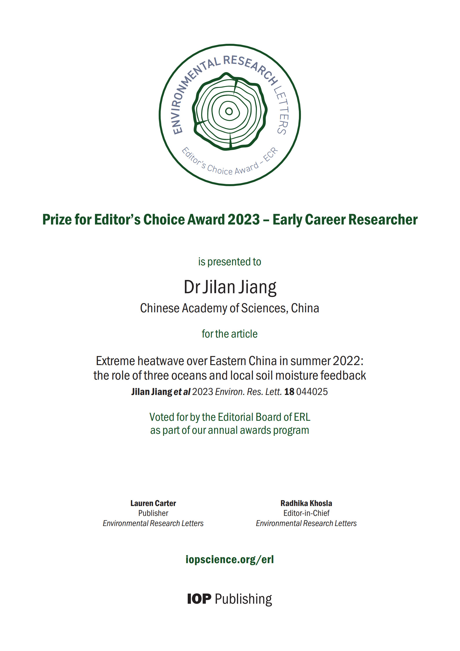 中国科学院大气物理研究所LASG国家重点实验室博士后姜继兰博士和所在团队吴国雄院士、刘屹岷研究员和毛江玉研究员合作完成的研究成果“Extreme heatwave over Eastern China in summer 2022: the role of three oceans and local soil moisture feedback”,于2023年3月在《Environmental Research Letters》期刊(影响因子5.8)发表。该论文目前已被他人引用76次,并荣获2023年该期刊的全球唯一的期刊编辑推荐最佳青年科研人员文章奖(Editor's Choice Award 2023-Early Career Researcher)。