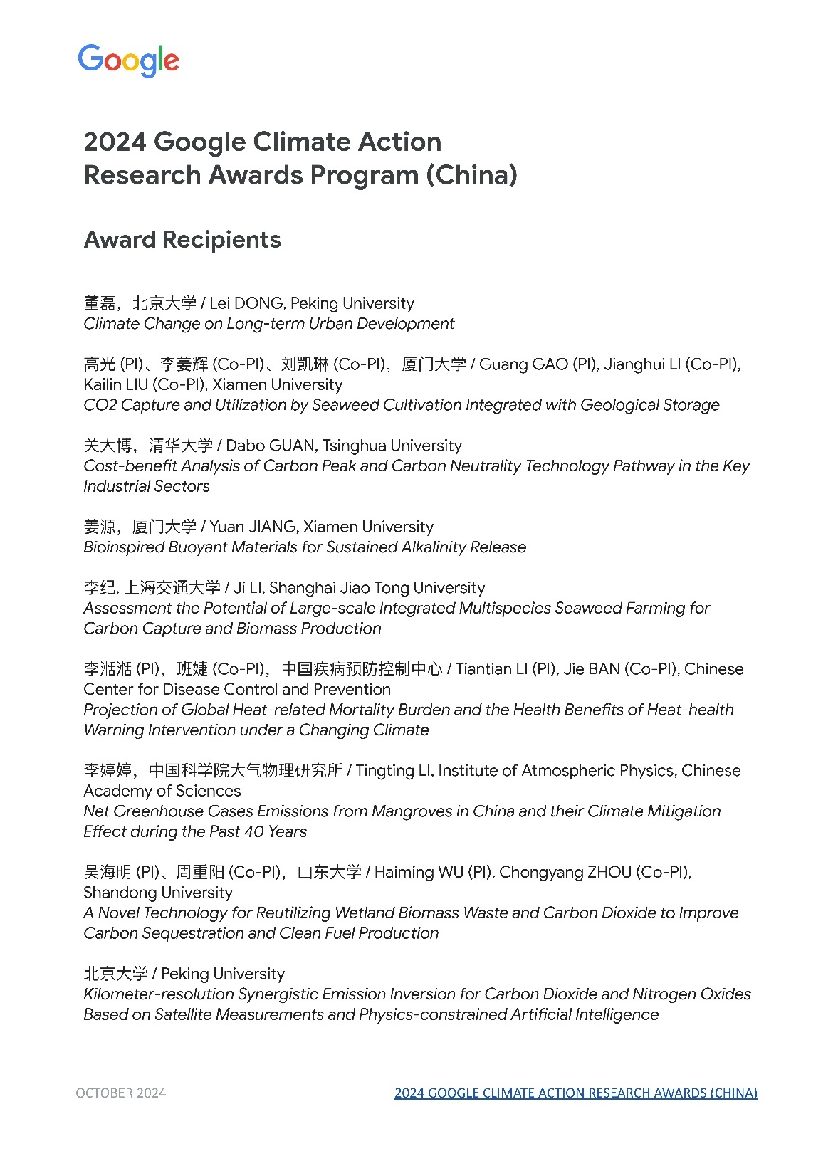 2024年度“Google Climate Action Research Awards”以推进气候解决方案为主题,聚焦于“Climate Action”,征集能够应对中国独特气候挑战、为全球碳中和与可持续发展做出贡献的提案。本年度获资助项目共9项,中国科学院大气所李婷婷研究员在几百位申请者中脱颖而出,成功获得资助(https://www.google.cn/intl/zh-CN_cn/university/sustainability/2024rfp/)。