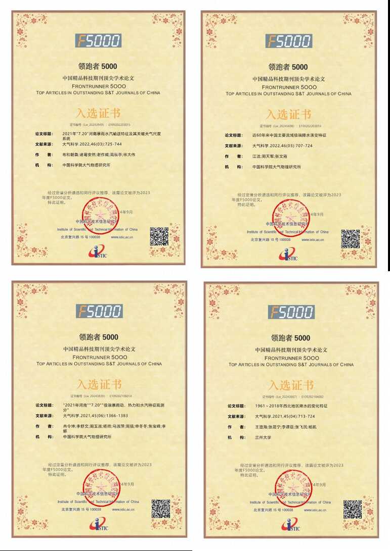 中国科学技术信息研究所评选出“领跑者5000——中国精品科技期刊顶尖学术论文”(简称“F5000”),《大气科学》有4篇论文成功入选2024年度论文名单。