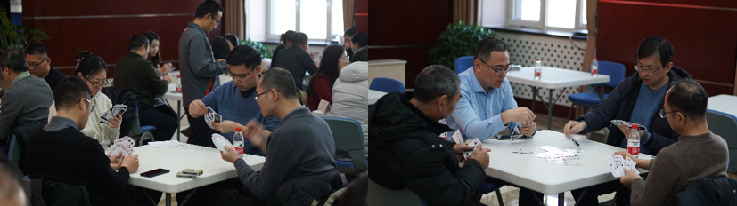 扑克牌比赛报名人数最多,也最有过年的气氛。32张牌桌上,选手们密切配合、心有灵犀,每一次出牌都深思熟虑,既要精准计算手中的牌局,又要与队友默契协作,甩牌声、欢笑声、讨论声交织在一起,构成了一曲充满活力的交响乐。选手们时而因打出一手好牌而欢呼雀跃,时而因局势紧张而紧锁眉头,现场气氛高潮迭起。最终张仁健携新搭档李爱国一路过关斩将,凭借着出色的牌技和绝佳的配合,在激烈的竞争中拔得头筹,卫冕成功!