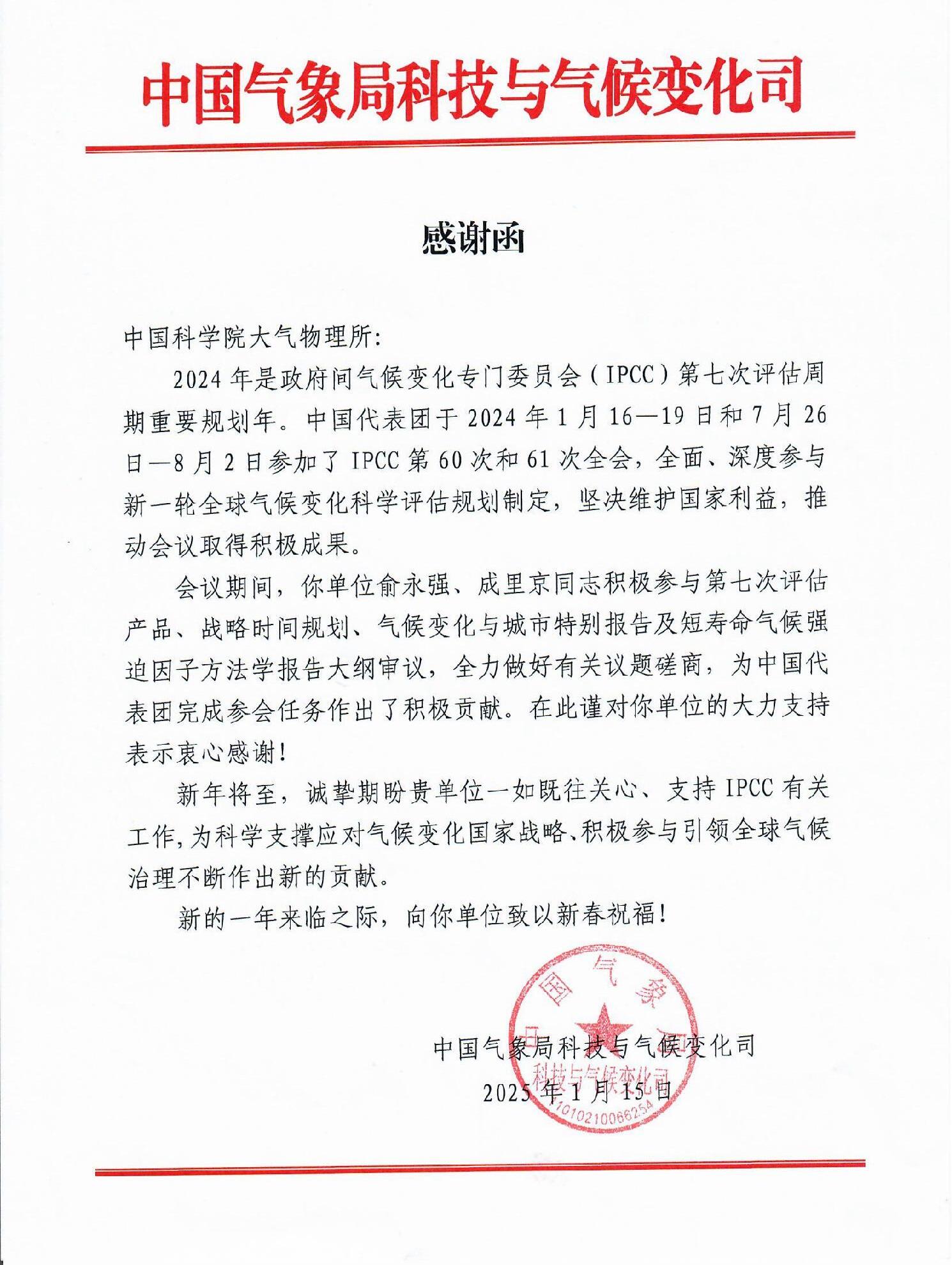 2024年是政府间气候变化专门委员会(IPCC)第七次评估周期重要规划年。中国代表团参加了IPCC第60次和61次全会。近日,中国气象局科技与气候变化司发来感谢信,感谢我所俞永强、成里京研究员积极参与IPCC第七次评估产品、战略时间规划、气候变化与城市特别报告及短寿命气候强迫因子方法学报告大纲审议,全力做好有关议题磋商,为中国代表团完成参会任务作出了积极贡献。(科技处供稿)