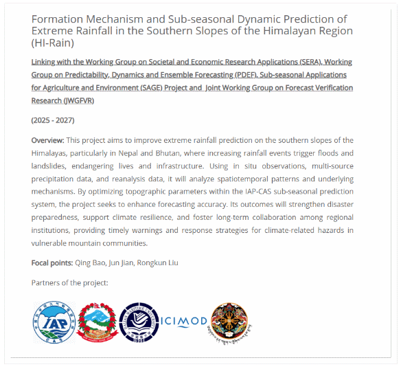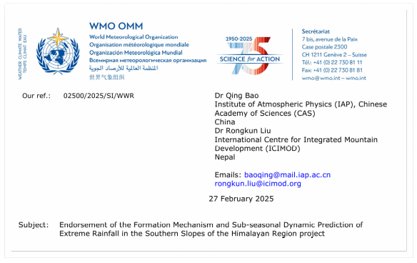 2025年2月27日,世界气象组织(WMO)世界天气研究计划(WWRP)科学指导委员会(SSC)正式致函,支持由中国科学院大气物理研究所刘鸿波研究员和包庆研究员负责的国家自然科学基金委可持续发展国际合作项目“喜马拉雅山脉南麓极端降水发生机理及次季节动力预测研究”(HI-Rain),并将其列入WMO WWRP认可与合作项目(Endorsed and Partner Projects)名单。