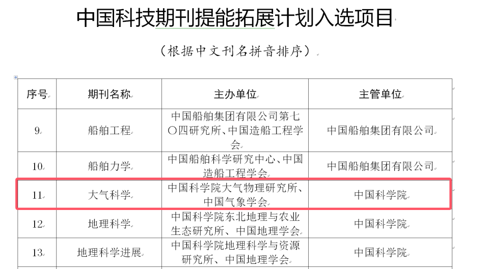 2025年6月12日,中国科学技术协会正式公布“中国科技期刊提能拓展计划”入选名单,《大气科学》凭借多年来在本学科领域内较高的学术水平和影响力成功入选!