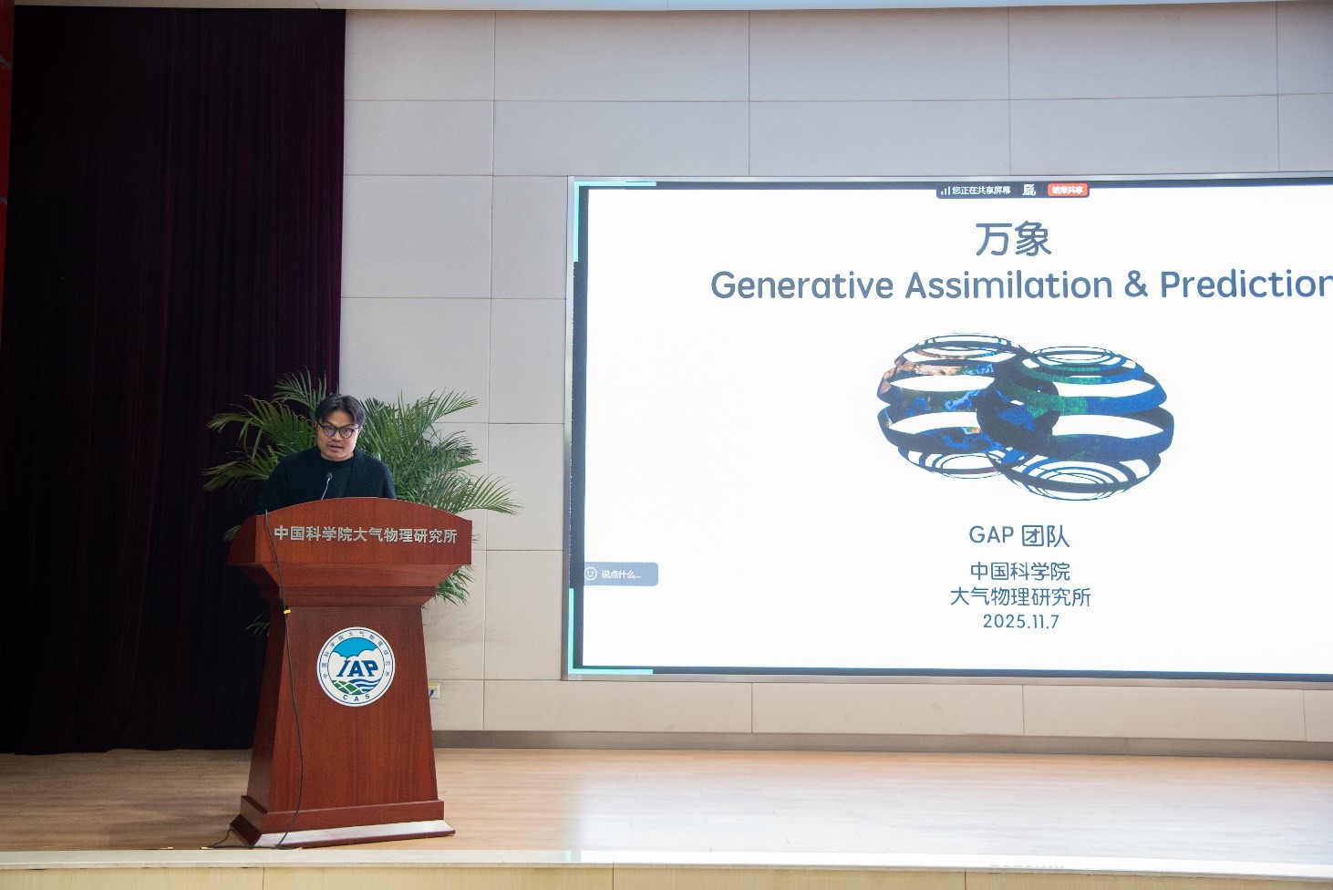 会议由肖子牛研究员主持,科技处姚利处长致开幕词。汇报交流会上,万象GAP技术领衔负责人潘宝祥博士的主报告“万象GAP:生成式同化预报模型”,重点介绍模型的理论基础、关键技术突破及在不同时间尺度气象预报的性能表现。四个分报告进一步聚焦万象GAP模型在数据同化、区域高精度预报、次季节到季节预报,以及在能源气象等应用场景中的性能和效果。万象GAP是由中国科学院大气物理研究所科研团队独立发展的天气气候一体化气象预报大模型。研发团队的开发工作部分受到国家重点研发计划项目“东北冷涡致灾机理及预报关键技术”的支持,旨在建立天气气候一体化的预报思路和应用技术。从初步的应用检验来看,万象GAP可以在气象预报、新能源资源评估开发、极端天气气候、灾害风险评估等领域有较好的应用前景。气象大模型伏羲研发团队、风乌研发团队、中国人民大学高瓴人工智能学院,以及中国气象局地球系统数值预报中心的AI专家也在会议上作了精彩的交流报告。