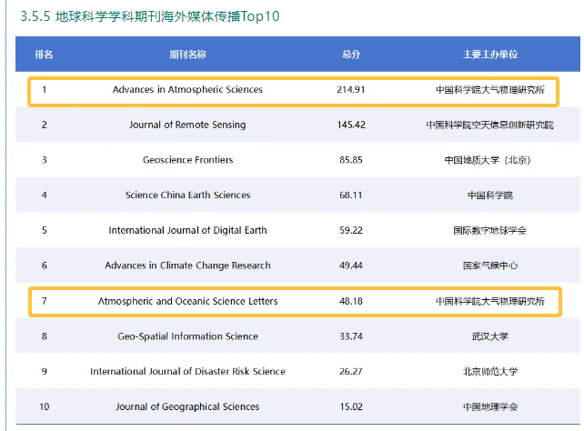 《2025中国英文科技期刊海外媒体传播影响力报告》近日发布,大气物理研究所主办的两本英文期刊《大气科学进展》(AAS)和《大气和海洋科学快报》(AOSL)在“中国英文科技期刊海外媒体传播百强榜单”分别位列第10和第60.