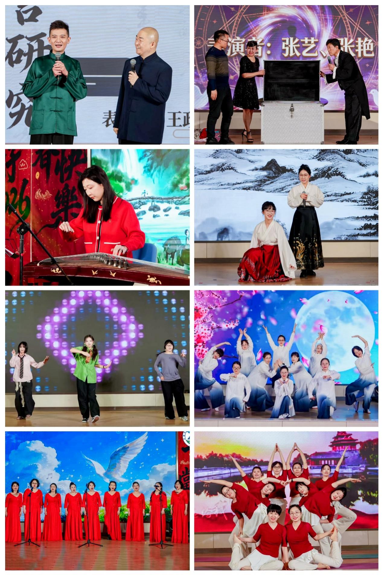 特邀北京曲艺团带来的相声《语言研究》与魔术《大变活人》更是将演出推向高潮,专业演员的精湛技艺让观众大呼过瘾。此外,古筝独奏《渔舟唱晚》的清雅悠远、女声对唱《兰亭序》的温婉动人、街舞《ZOO》的活力动感、气舞《锦绣中华》的柔美舒展,以及小合唱《乘着歌声的翅膀》的悠扬婉转,共同构筑了一场精彩绝伦的视听盛宴。瑜伽协会演绎的《我和我的祖国》瑜伽编舞,以刚柔并济的肢体语言抒发家国情怀,令人动容。