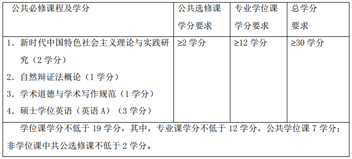 硕士研究生申请硕士学位前,总学分应不低于36学分,包括课程学习总学分不低于30学分和必修环节6学分。课程学习体系及学分要求如下: