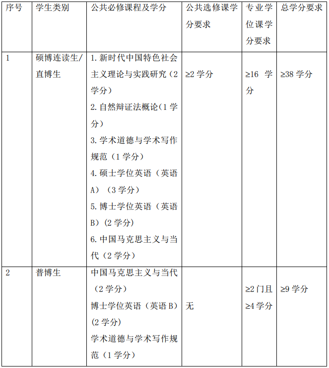 硕博连读生、直博生在申请博士学位前,总学分应不低于44学分,包括课程学习不低于38学分和必修环节6学分。在课程学分中,学位课学分不低于27学分,其中专业学位课不低于16学分,公共学位课11学分;非学位课中公共选修课不低于2学分。