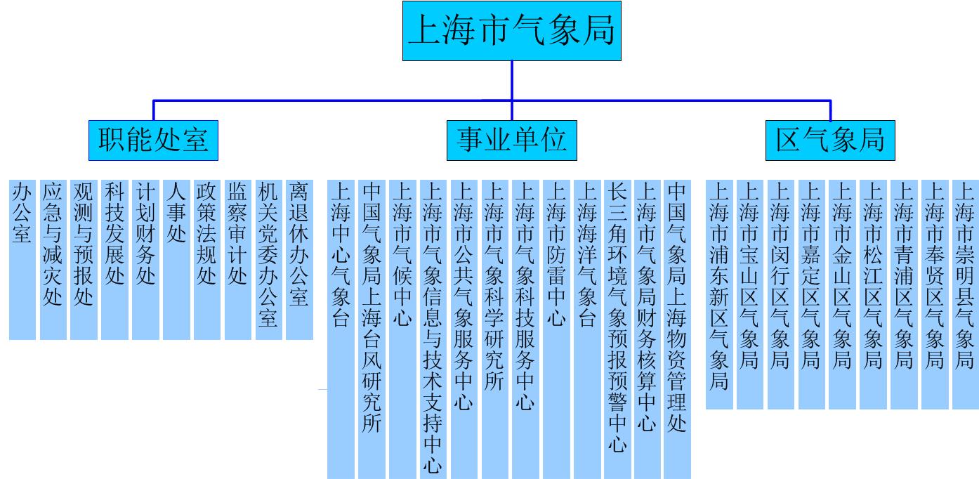 上海市气象局实行上级气象主管机构与本级人民政府双重领导,以上级气象主管机构领导为主的管理体制,在上级气象主管机构和本级人民政府领导下,根据授权承担上海行政区域内气象工作的政府行政管理职能,依法履行《中华人民共和国气象法》和气象主管机构的各项职责。