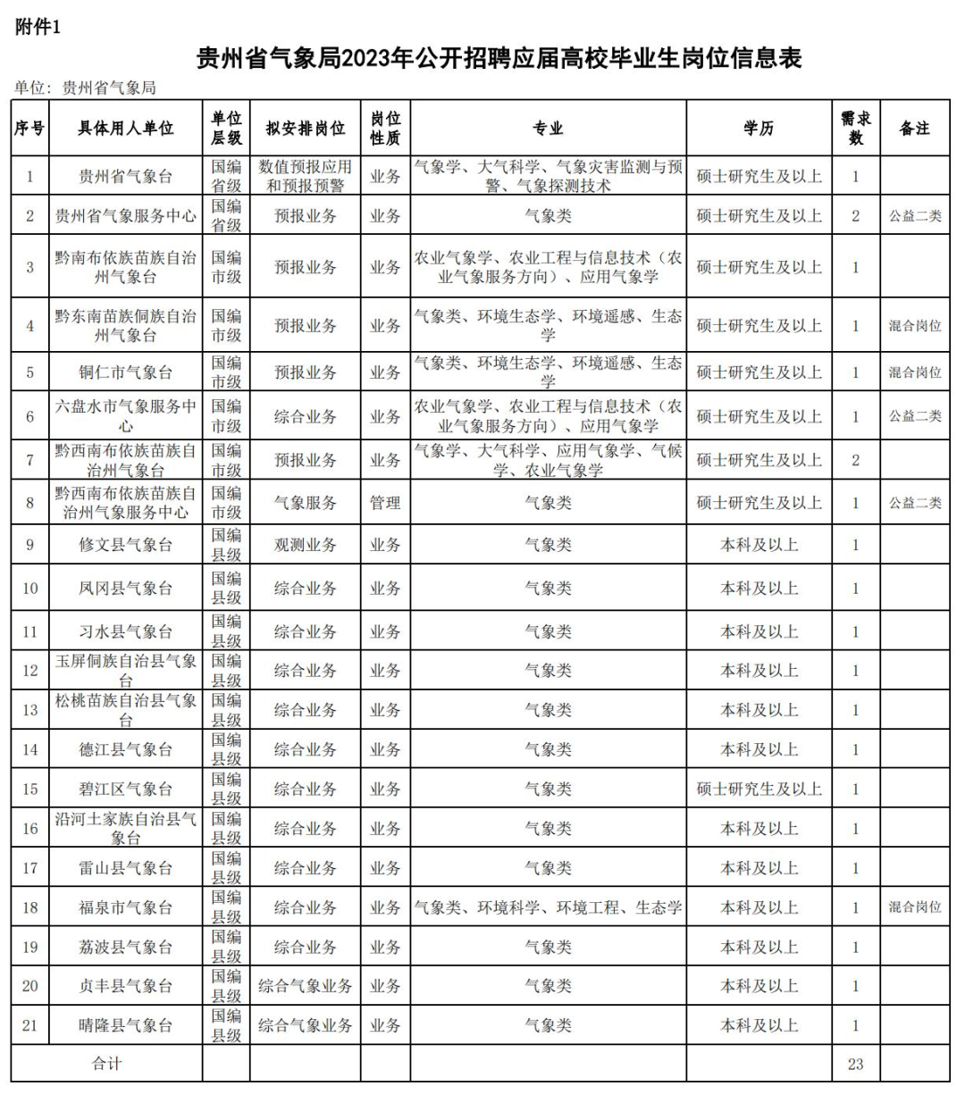 各招聘单位的招聘岗位、招聘人数、招聘岗位专业等详见《贵州省气象局2023年公开招聘应届高校毕业生岗位信息表》(附件1)。专业根据中国气象局人事司《气象部门人员招录专业目录》(附件2)认定。