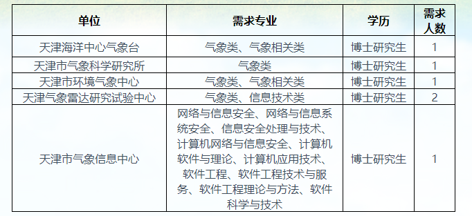 为推进人才强局战略,广泛引进高层次人才和业务岗位急需人才,现天津市气象局所属部分单位补充招聘2023年应届高校毕业生,具体用人单位、专业、学历及需求人数如下。