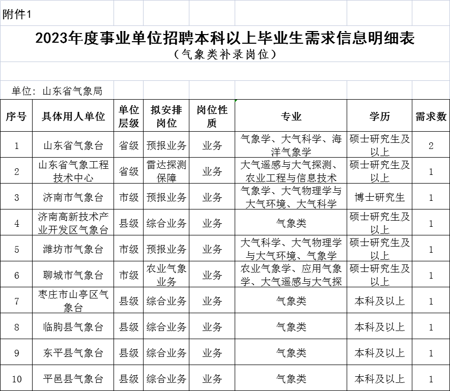具体信息详见《山东省气象局2023年度事业单位招聘本科以上毕业生需求信息明细表(气象类补录岗位)》(附件1)。