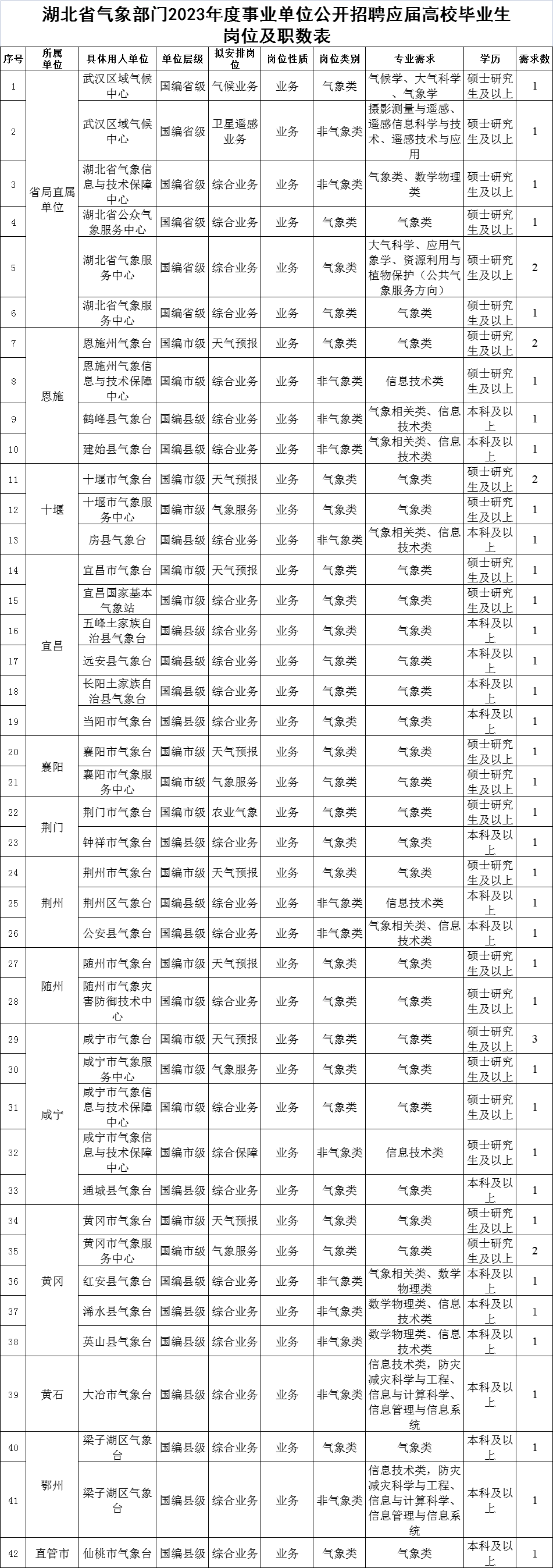 根据《事业单位人事管理条例》《事业单位公开招聘人员暂行规定》《气象部门事业单位公开招聘应届高校毕业生管理办法》的要求,对湖北省气象部门2023年度事业单位公开招聘空缺岗位进行补录。现将有关事项公告如下: