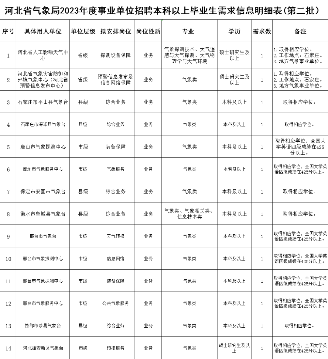 各招聘单位的招聘岗位、招聘人数、招聘岗位条件等详见《河北省气象局2023年公开招聘应届毕业生岗位信息表(第二批)》(附件1)。专业根据中国气象局人事司《气象部门人员招录专业目录(2021年版)》(附件2)认定,所学学科专业不在该目录中,但与岗位所要求的学科专业类同的应聘人员,可以主动联系河北省气象局人事处确认报名资格。