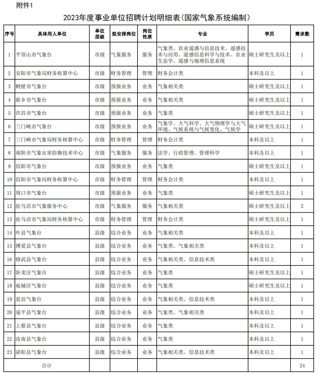 河南省气象部门2023年度国家气象系统编制招聘计划(第三批)拟公开招聘应届高校毕业生24名,具体岗位见附件1。
