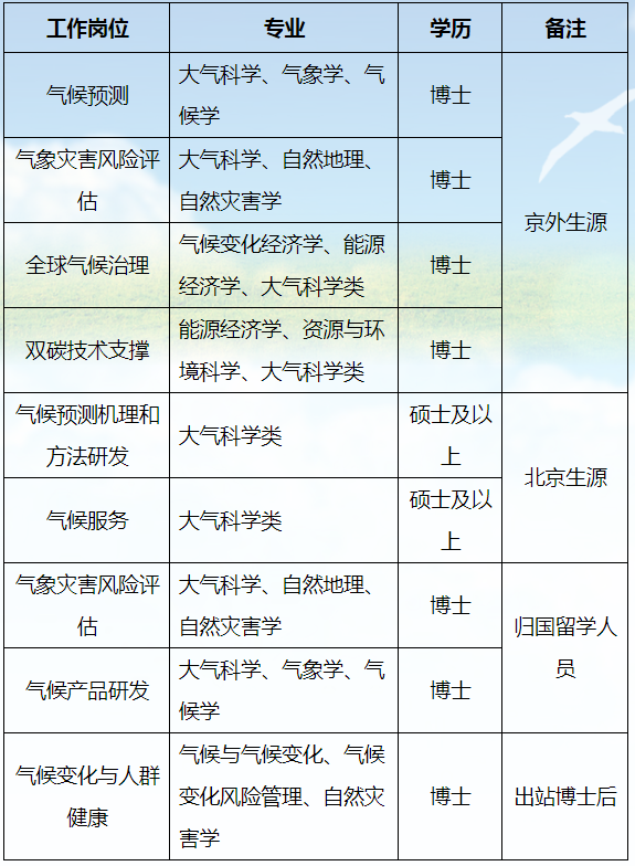 根据全面推进气象现代化和国家气候中心高质量发展需要,国家气候中心公开招聘2024年应届高校毕业生,各岗位需求人数以上级主管部门批复数为准,具体岗位及相关要求详见下表: