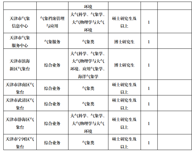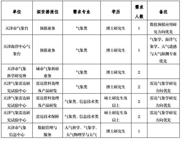 为推进人才强局战略,广泛引进高层次人才和业务岗位急需人才,现天津市气象局所属事业单位、区气象局公开招聘 2024 年应届毕业生,具体需求见下表: