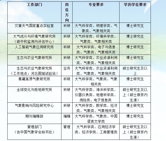 南京气象科技创新研究院、青岛海洋气象研究院和青藏高原气象研究院的招聘计划另行公布。