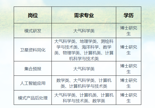 根据《气象高质量发展纲要(2022—2035年)》以及 “十四五”数值预报业务发展规划提出的发展目标和任务需求,公开招聘2024届国内高校毕业生,需求如下(具体需求人数以上级主管部门批复数为准)。