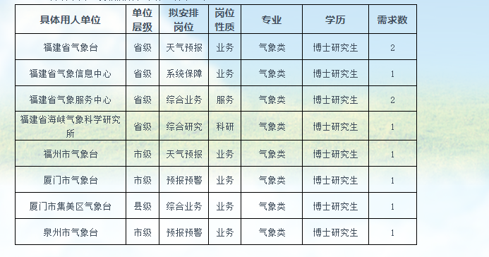 招聘信息在中国气象局网站(www.cma.gov.cn)、气象人才招聘网(zp.cmatec.cn)和福建省气象局网站(fj.cma.gov.cn)公开发布。