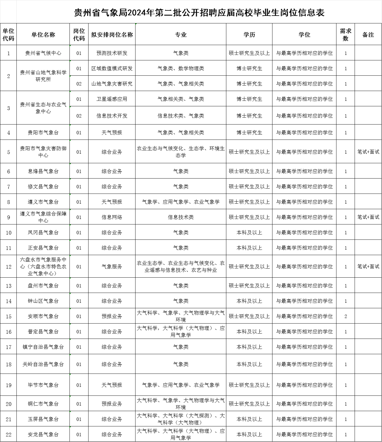 各招聘单位的招聘岗位、招聘人数、招聘岗位专业等详见《贵州省气象局2024年第二批公开招聘应届高校毕业生岗位信息表》(附件1)。专业根据中国气象局人事司《气象部门人员招录专业目录(2024年版)》(附件2)认定。