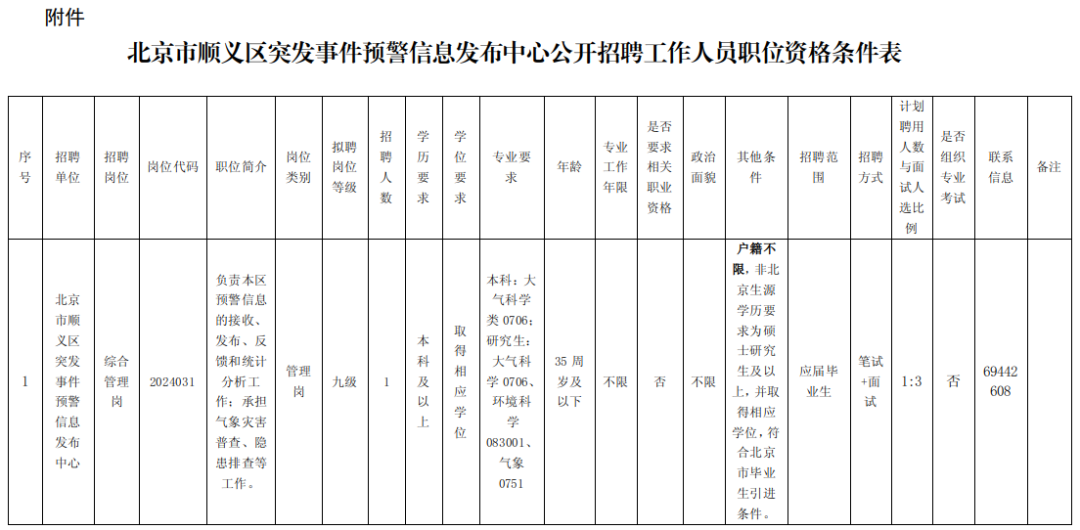 综合管理岗,负责本区预警信息的接收、发布、反馈和统计分析工作;承担气象灾害普查、隐患排查等工作。详见附件《顺义区突发事件预警信息发布中心公开招聘工作人员职位资格条件表》。