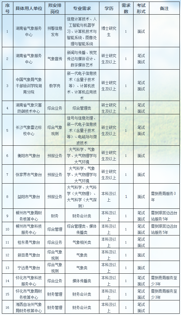 本次招聘共设岗位16个,计划招聘国家气象事业编制本科以上毕业生16人,具体岗位需求见下表: