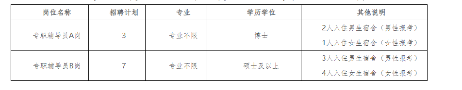专职辅导员10人(其中5人需入住男生宿舍,5人需入住女生宿舍),纳入事业编制管理。具体如下: