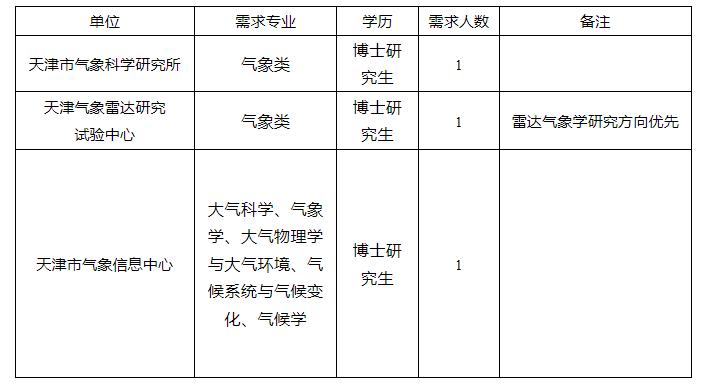 为广泛引进高层次人才和业务岗位急需人才,天津市气象局所属事业单位公开招聘2024年普通应届高校毕业生,具体需求见下表。专业根据中国气象局人事司《气象部门人员招录专业目录(2024年版)》认定。