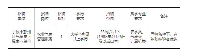 因工作需要,宁波市鄞州区气象局下属事业单位拟面向社会公开招聘编外工作人员1名。现将有关事项公告如下: