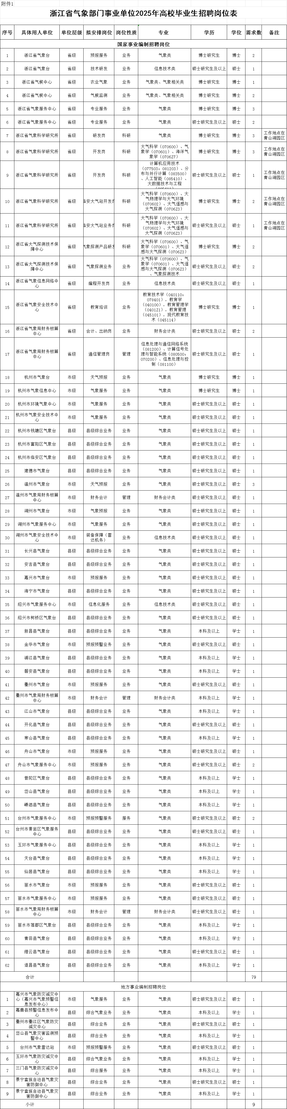 招聘单位、岗位、专业、学历、学位等要求详见《浙江省气象部门事业单位2025年高校毕业生招聘岗位表》(见附件1)。