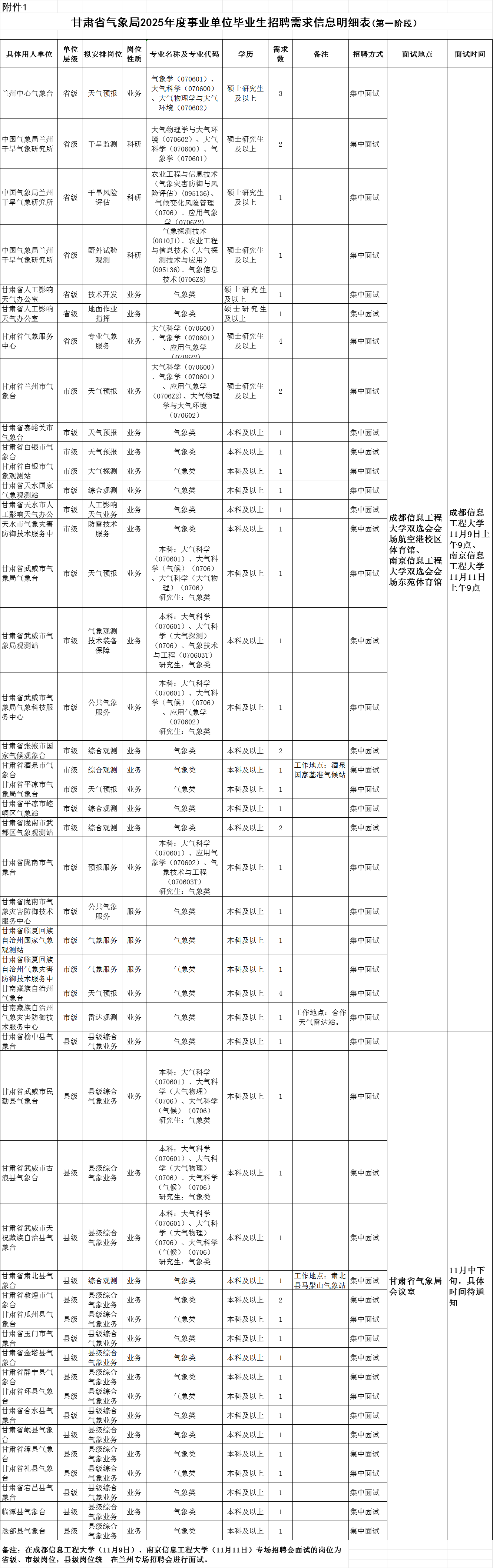 省级、市级岗位在成都信息工程大学(11月9日)、南京信息工程大学(11月11日)专场招聘会当天进行集中面试,县级岗位将于11月中下旬在兰州进行集中面试,具体安排见面试公告。