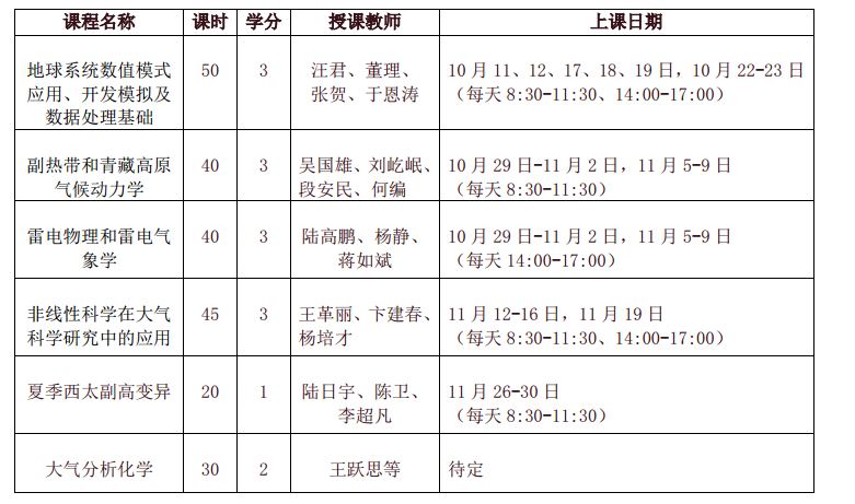 本学期开设《副热带和青藏高原气候动力学》 等6门研究生所级课程等,请选课同学安排好时间,按时听课。欢迎感兴趣的同学旁听。具体安排如下: