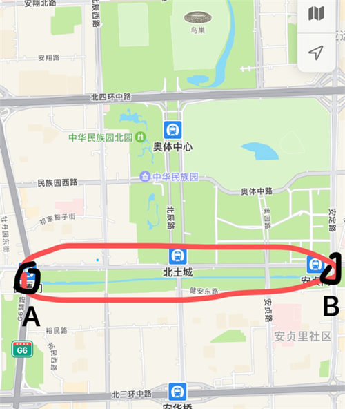 2. 请报名人员于4月11日12:40前到达健德门地铁站西南口(C口)附近的公园入口(示意图A点),并在下图的标记位置处完成签到。