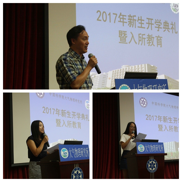 9月5日上午9时,中国科学院大气物理研究所2017年新生开学典礼与入所教育活动在地质所二楼报告厅隆重举行。2017级秋季入学博士生、2016级硕士生及直博生、2016级大气所与成都信息工程大学联合培养硕士生、大气所与云南大学共建菁英班2014级本科生等共计170多人参加了开学典礼和入所教育活动。大气物理研究所党委书记陈洪滨、所学位委员会副主任、中国科学院院士吴国雄、中国科学院院士吕达仁、副所长程新金、副所长陆日宇、所学术秘书、LAPC主任王自发、LASG主任肖子牛等领导和导师出席了开学典礼。典礼由研究生部孙鹏宇主持。