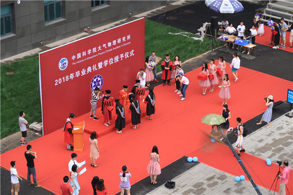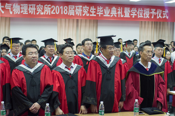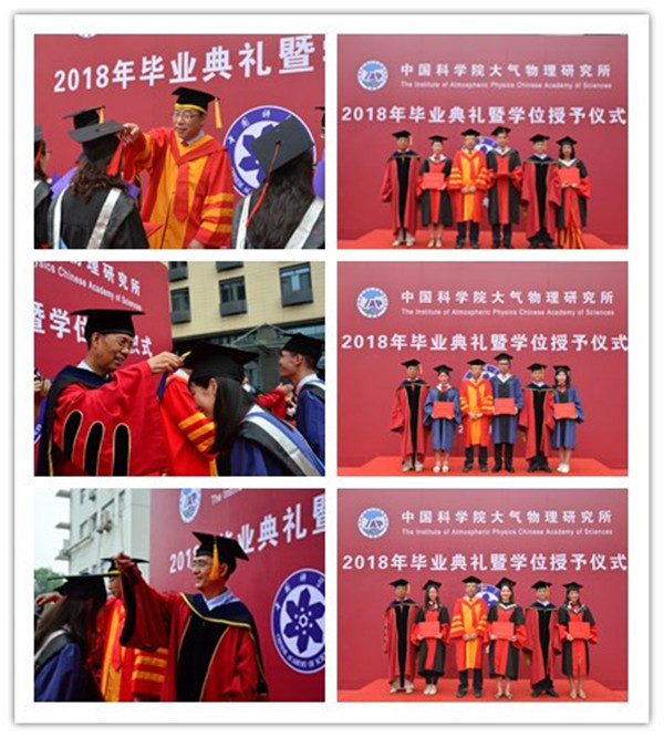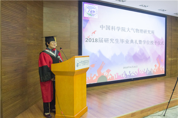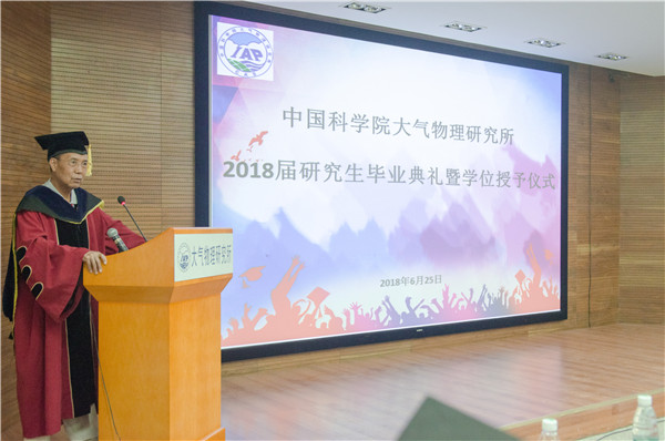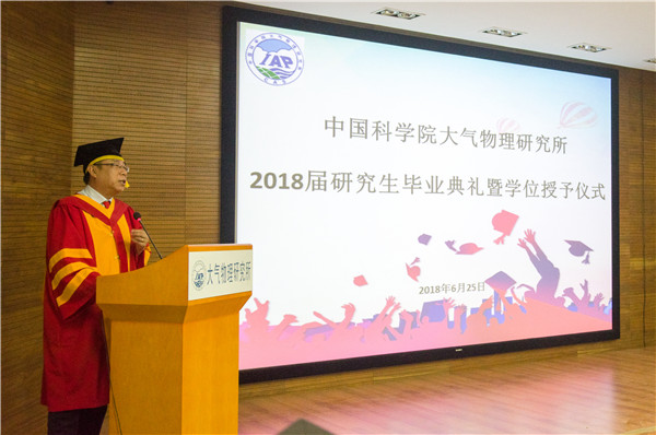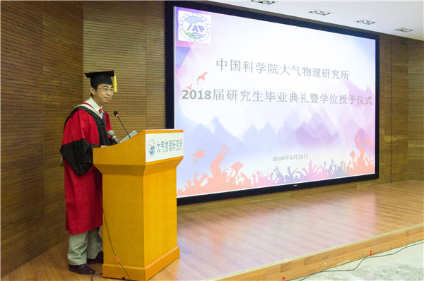 2018年6月25日14时30分,中国科学院大气物理研究所2018年度研究生毕业典礼暨学位授予仪式在科研楼101会议室和IAP广场隆重举行。仪式由副所长陆日宇研究员主持,所长朱江研究员、学位委员会副主任吴国雄院士、所党委书记、学位委员会副主任陈洪滨研究员和30余名研究生导师、近80名毕业生及毕业生的家属、朋友、师弟师妹共计200多人参加了本次毕业典礼暨学位授予仪式。