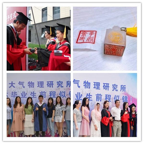 接着,导师们为自己的学生颁发毕业纪念品。毕业生们从导师手上接过刻有自己名字以及大气所所标的印章时,惊喜和感动溢于言表。颁奖结束后,毕业生和导师纷纷来到签名墙,在“祝大气物理研究所全体毕业生前程似锦!”的背板上留下了自己的签名,并合影留念。