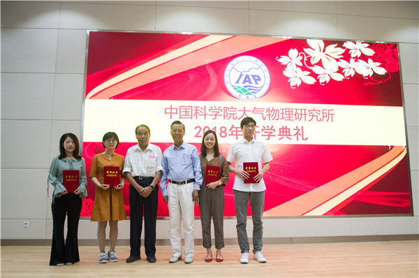 王生林宣读了2018年中国科学院大气物理研究所研究生获奖名单,吴国雄院士、石广玉院士为获奖学生代表颁发证书。