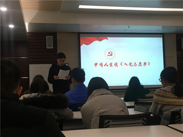 之后支部开展了董鑫同志的发展大会,研究生部孙鹏宇老师也参加了此次会议。在董鑫同志宣读《入党志愿书》之后,其入党介绍人倪启晨同志和刘博同志(唐颢苏同志代为宣读意见)以及其他党员同志对董鑫同志在各方面的表现发表意见,支部组织委员孙华敏同志宣读支委会对董鑫同志的审查情况,同意董鑫同志发展为预备党员。在支部集中讨论后,正式党员进行了投票表决,支部正式党员38人,实到31人,同意30票,反对0票,弃权1票,会议通过董鑫同志发展为预备党员。随后,孙鹏宇老师发表了讲话,发言中提到了要注重研究生素质和修养的培养,希望支部的各位同志都能成为有品格、有理想、有信仰、有温度的人。