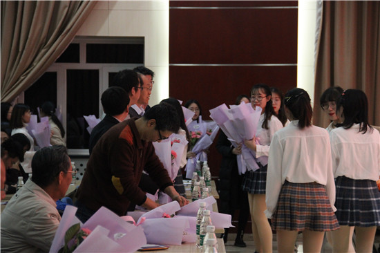 值此佳节,为表达同学们对兢兢业业、辛勤付出的导师们的感谢,晚会设置了一个特别环节,让学生代表为在场的导师送上鲜花,明媚而温暖的康乃馨代表着学生对老师的“爱”与“尊敬”。