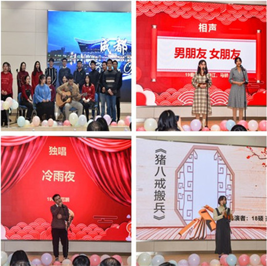 为了吸引观众们更好地参与到晚会的互动中来,晚会还设置了抽奖环节,为同学们在新年伊始送去了第一份祝福。游戏环节则极大地激发了大家的参与热情:“你划我猜”考验了大家的默契度与反应能力;“猜歌名”游戏让大家看到研究生中卧虎藏龙,不论新歌还是老歌,同学们都如数家珍;“成语接龙”和“吹气球”引得台下观众也纷纷出谋划策,现场气氛十分热烈。