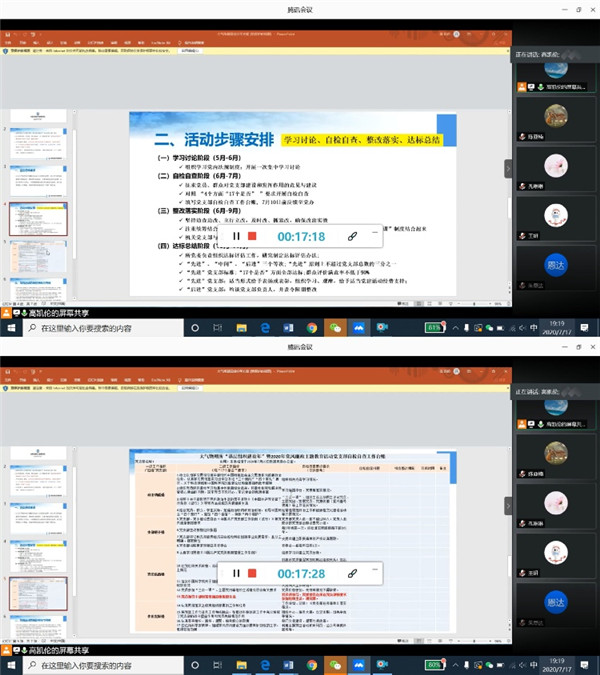 7月17日晚7点,党支部组织线上会议,开展“2020年全面从严治党”主题组织生活会,旨在分享党小组学习成果与感悟并集中学习党内法规制度,并就本支部可能存在的问题对照台账进行自检自查。在学习讨论过程中,陆婷婷举出抗疫反面案例——“一问三不知主任”唐志红的事件,警醒大家作为党员,要高标准严要求,始终坚持以人为本、为人民服务的信念,认真做好自己工作的同时起好模范带头作用。在支部党员王妍凤的带领下,支部党员集中学习了习近平总书记的重要论述《论坚持党对一切工作的领导》,她认为广大党员要从忠诚的政治品格、坚定的理想信念、实干的工作本领等方面不断锻炼自己。第三小组党小组长张冠舜与大家分享了学习心得,首先他认为党员应该坚定理想信念,在疫情的重大考验下,共产党领导下的中国成为最快抵御新冠疫情的国家,历史证明中国共产党的领导方向是正确的,因此我们要肩负起历史使命积极推动我国社会主义事业;紧接着他就近期港版《国安法》的颁布实施谈到了要坚持党的基本路线不动摇;最后他从习总书记的重要讲话中领悟到要严明党的政治纪律,加强对权力运行的制约和监督,加强党内党员的教育管理,以近期网络上曝光高考不公平背后的腐败现象为例,表示从严治党应该坚决贯彻实施,加大对腐败的打击,建设公平公正的社会制度。张苗就《严明党的纪律》向支部党员分享了她的学习心得,她指出从严治党严明党纪有利于党的建设,反腐以来多位腐败高官落马,拔掉党内蛀虫有利于党的长期正确发展;严明党纪对增强老百姓对党的信心也十分关键,具体可以表现在强力正风反腐让以前需要送礼才能办事的现象得到遏制。