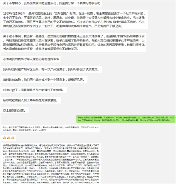 支部党员黄昕向大家分享了开国领袖毛主席的家风教育,在抗美援朝期间,主席派自己的儿子奔赴战场,为全党做出表率,这种“恋亲不为亲徇私,念旧不为旧谋利,济亲不为亲撑腰”的家风值得学习。黄昕还向大家分享了自己亲人的优良家风教育,大姨作为社区医院医生,在疫情危难之际,她没有听从旁人让她继续请假的劝阻,义无反顾走向自己的岗位,肩负起自己的责任,为后辈做出最好的表率。最后黄昕认为优良的家风需要传承,我们要学习一切优良家风,作为个人而言,现在我们所坚持的就是以后我们传递给后人的。刘海玲同志分享了她爷爷的家风故事,面对亲人犯错不包庇,坚持原则;一辈子从未说谎,在后辈心里爷爷就是诚实正义的化身。高凯伦补充道,老一辈党员的舍小家为大家的风格值得我们每个人学习,现在的大力反腐正是为了杜绝这种为一己私利损坏人民利益的腐败行为,让每位党员真正做到全心全意为人民服务。胡帅同志代表党小组发言,向大家分享了闻一多先生的家风故事,闻家家训要求闻家后人“清白做人,朴实做事,心地善良,并利用科学文化知识报效祖国”,闻一多先生的成就离不开优良的家风教育。孙雪倩同志和向大家分享了抗疫英雄钟南山的优良家风,钟院士的父亲虽生活艰苦,却也通过努力学习考入北京协和医院。正是父亲对医学的热爱,对医学事业的执着追求及无私奉献,深深感染了他。父亲这种以身作则营造的优良家风在一定程度上成就了钟南山,如今钟院士已经84岁,依然奋斗在抗疫一线。钟院士的孩子也继承了祖辈的优良品格,正是在这种优良家风建设下,钟家几代人人才辈出。孙雪倩指出一个家庭的优良家风建设尤为重要,家风纯正雨润万物,一个家庭最大的财富不是金钱,而是教育,只有言传身教以身作则,一个家庭一个家族才能形成溶于血脉的世界观价值观人生观,只有家风正,才能人心正。
