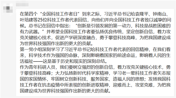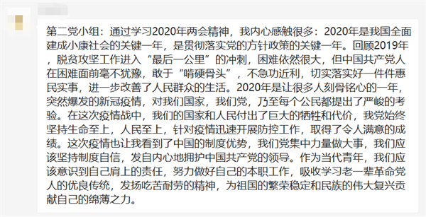 各个党小组成员积极分享了学习材料的感想。其中,第一党小组深刻学习了习近平总书记给科技工作者代表的回信精神:科学技术作为强国的命脉,深刻影响着国家的前途命运,影响着人民的生活福祉——这是基于历史和现实的深刻总结。同时倡议我们作为青年科研人员,应勇于攀登科技高峰,学习老一辈科技工作者矢志报国的家国情怀,发扬我国科技工作者在抗击疫情中所表现的创新进取精神,迎难而上、攻坚克难,为把我国建设成为世界科技强国做出新的更大的贡献。第二党小组通过学习2020年两会精神,产生了很多感触:2020年是我国全面建成小康社会的关键一年,是贯彻落实党的方针政策的关键一年,而突然爆发的新冠疫情,对我们国家,我们党,乃至每个公民都提出了严峻的考验。这次疫情让我们看到了中国的制度优势,我们党集中力量做大事,切实落实好一件件惠民实事。第三党小组在阅读习近平总书记关于家庭家教家风建设的重要论述摘编后,联系到各位同学的实际情况,提到:“现在我们很多同学已经组成家庭,还有一些同学已经为人父母,所以更要明白家风的重要性。” 只有每一个家庭都既承担起“帮助孩子扣好人生的第一粒扣子,迈好人生的第一个台阶”的重担,又承载起帮助孩子“在为家庭谋幸福、为他人送温暖、为社会作贡献的过程中提高精神境界、培育文明风尚”的重任,这样家庭培养出来的孩子才能够在“自觉承担家庭责任、树立良好家风”以及为社会做出有益贡献等方面打下良好的思想基础、品德基础和人格基础。第四党小组通过观看钱三强、华罗庚、童第周、欧阳自远和丘成桐等老一辈科学家在《谢谢了,我的家》节目上的家风故事,深刻地认识到优良家风的重要意义。正是代代相传的家训“从牛到爱”,使钱三强先生家三代人都像孺子牛一样认认真真地生活和工作,同时对科学事业也要充满着像牛顿爱因斯坦一样的开拓创新精神。