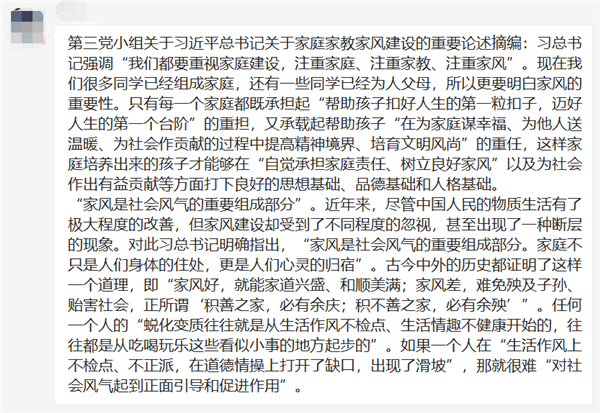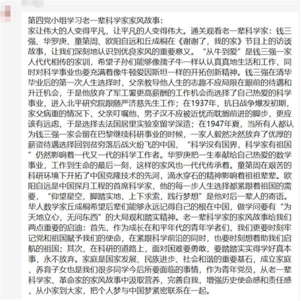 老一辈科学家的家风故事给我们两点重要的启迪:首先,作为成长在和平年代的青年学者们,我们更要时刻牢记党和祖国赋予我们的使命,在紧跟科学前沿的同时,始终把国家利益、集体利益放在首位;其次,在科研的道路上,面对困难要迎难而上,要踏踏实实地学好真本事,开拓进取,永不放弃。家庭是国家发展、民族进步、社会和谐的重要基石,成立家庭,养育子女也是我们很多同学今后所要面临的事情。作为青年党员,我们应该意识到自己肩上的责任,努力做好自己的本职工作,从老一辈科学家、革命家的家风故事中汲取营养,完善自我,增强历史使命感和责任感,从小家到大家,把个人梦与中国梦紧密联系在一起,为祖国的繁荣稳定和民族的伟大复兴贡献自己的绵薄之力。(18秋博党支部供稿)