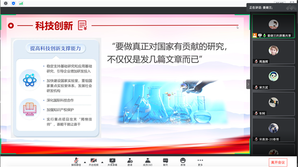 会议伊始,宣传委员周逸辉作题为《弘扬优良传统 坚定创新自信》的报告,带领支部党员深入学习习近平总书记给科技工作者代表的回信精神。他通过30句话梳理回顾了习近平总书记对科技工作者的殷切期望,并结合自己的科研心得,阐述了习近平总书记回信精神的丰富内涵。报告强调,“具有强烈的爱国情怀,是对我国科技人员第一位的要求”。周逸辉呼吁同学们在探索自己感兴趣的科学问题的同时,也要心系经济社会发展和广大人民群众,勇于解决关键科技难题,为国家现代化做贡献。