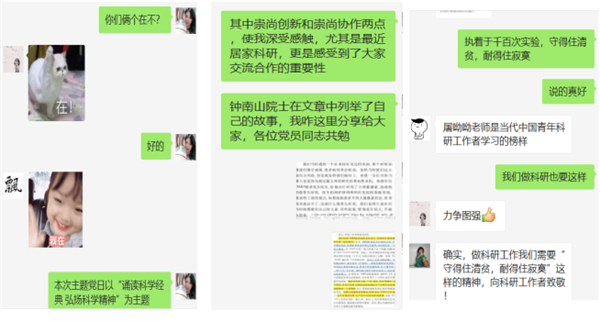 张敬萍同志首先发言,她阅读了钟南山院士的文章《科学研究应当崇尚的五点精神》,其中崇尚创新和崇尚协作两点精神,使她深受感触,尤其是最近居家科研,更是感受到了大家交流合作的重要性。张敬萍不仅分享自己的体会,更是将文章中的事例截图分享给大家,希望各位党员同志共勉。赵丹同志将自己阅读《梦想靠科学实现》的体会分享给大家,袁隆平院士的这篇文章中讲述了他的两个梦想,一个是“禾下乘凉梦”,一个是“杂交稻覆盖全球梦”,这两个梦想的实现都需要依靠科学技术,发扬科学精神。我们现在是科学世界的初探者,以袁院士这样的科学家为榜样,学习他们的科学精神和科学思维,自己未来的发展一定会受益无穷。林文青重点学习了《屠呦呦:我有一个希望》。屠呦呦老师为了一个使命,执着于千百次实验,守得住清贫,耐得住寂寞。屠呦呦对学术信仰的自信与坚守,对科学事业的热爱与严谨和“功成不必在我”的奉献精神都是当代中国青年科研工作者学习的榜样,我们应该力争图强,永攀科研高峰。